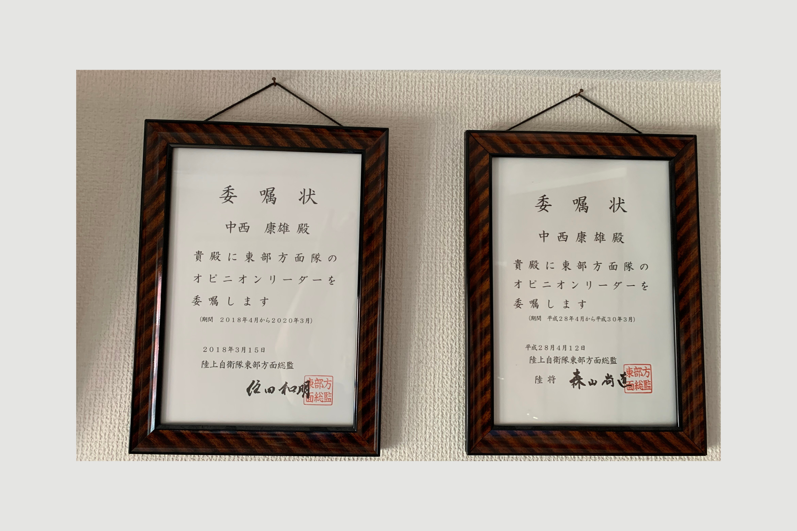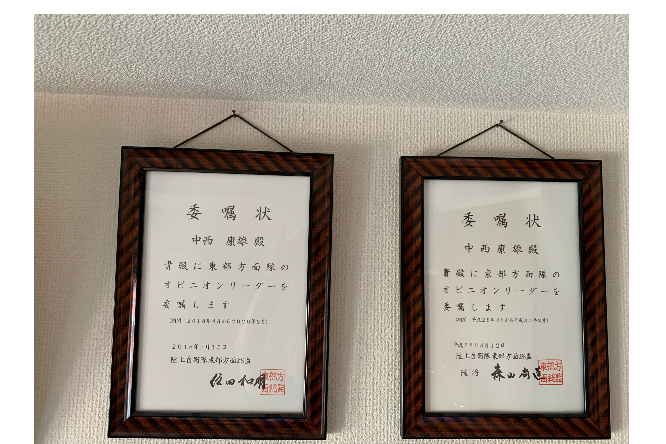 2016年4月に、防衛省 陸上自衛隊 東部方面隊からオピニオンリーダーに委嘱されました。 オピニオンリーダーは、国の安全保障政策に対する理解を深め、 情報提供や広報活動に加え、市民との対話を通じて、国防に関する意識を高め、国家の安全と防衛に貢献する事を目的としています。これからも国の安全保障政策に対する理解を深め、声を政策に反映して参ります。 今後も、皆様の信頼とご支援をいただきながら、日本国の安全と繁栄に向けて全力を尽くしてまいります。