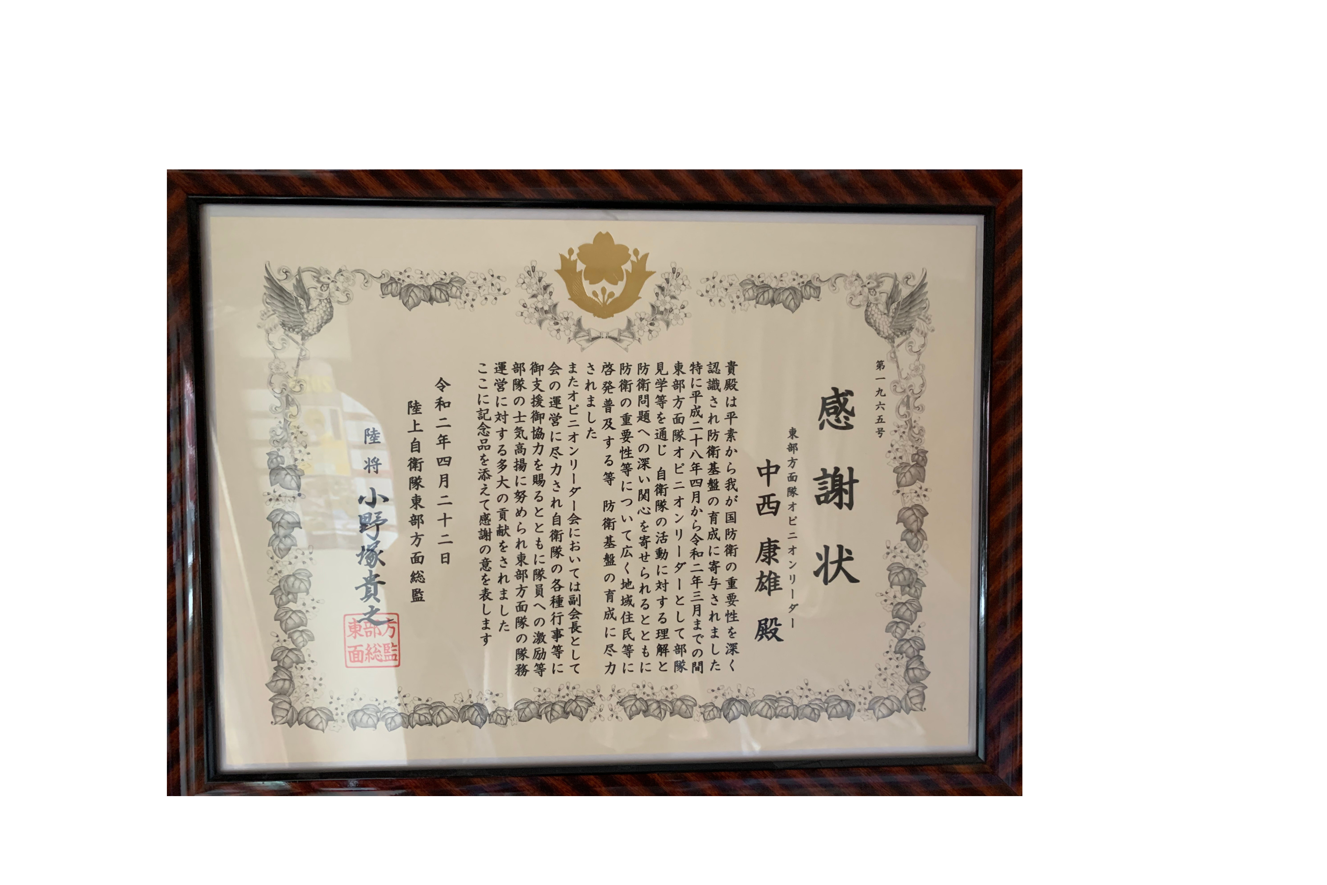 2016年4月に、防衛省 陸上自衛隊 東部方面隊からオピニオンリーダーに委嘱されました。 オピニオンリーダーは、国の安全保障政策に対する理解を深め、 情報提供や広報活動に加え、市民との対話を通じて、国防に関する意識を高め、国家の安全と防衛に貢献する事を目的としています。これからも国の安全保障政策に対する理解を深め、声を政策に反映して参ります。 今後も、皆様の信頼とご支援をいただきながら、日本国の安全と繁栄に向けて全力を尽くしてまいります。